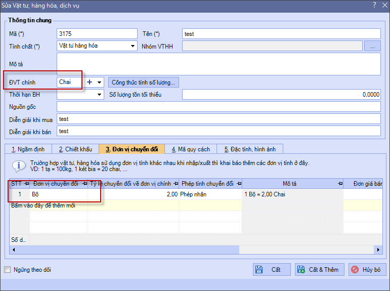 Nếu trường hợp có phát sinh đơn vị chuyển đổi thì chuyển qua kiểm tra tiếp theo Bước 3. Bước 3: Kiểm tra phần đơn vị chuyển đổi, tỷ lệ và số lượng theo đơn vị chuyển đổi của Vật tư hàng hóa đã đúng theo tỷ lệ khai báo chưa?