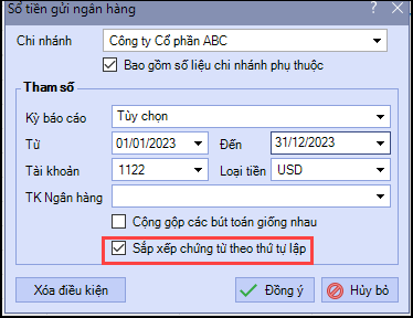 - In sổ kế toán Chi tiết Quỹ tiền mặt, Sổ tiền gửi ngân hàng\ Tick chọn Sắp xếp chứng từ theo thứ tự lập\ Nếu trong cùng ngày chứng từ chi trước chứng từ thu báo cáo sẽ bị âm
