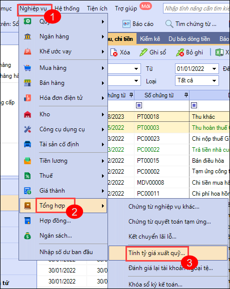 Bước 2: Vào Nghiệp vụ/Tổng hợp/ Tính tỷ giá xuất quỹ. Sau đó kiểm tra lại báo cáo.