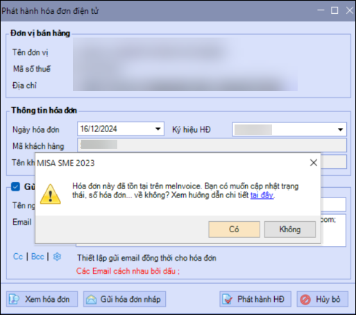 Biểu hiện: Khi phát hành hóa đơn báo lỗi: Hóa đơn này đã tồn tại trên meInvoice. Bạn có muốn cập nhật trạng thái, số hóa đơn…về không?