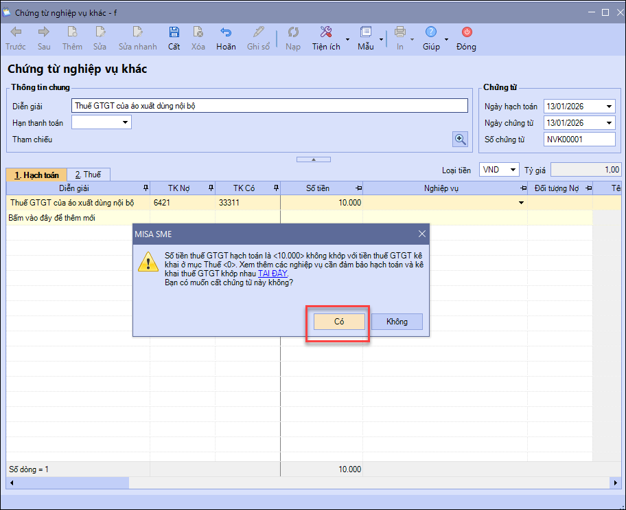 Bước 3: Nhấn Cất phần mềm có thông báo “Số tiền thuế GTGT hạch toán không khớp với tiền thuế GTGT kê khai ở mục thuế” thì bỏ qua thông báo này và nhấn Có để Cất chứng từ