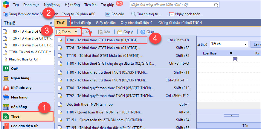 Bước 1: Vào phân hệ Thuế \nhấn Thêm\chọn TT80 – Tờ khai thuế GTGT khấu trừ (01/GTGT)