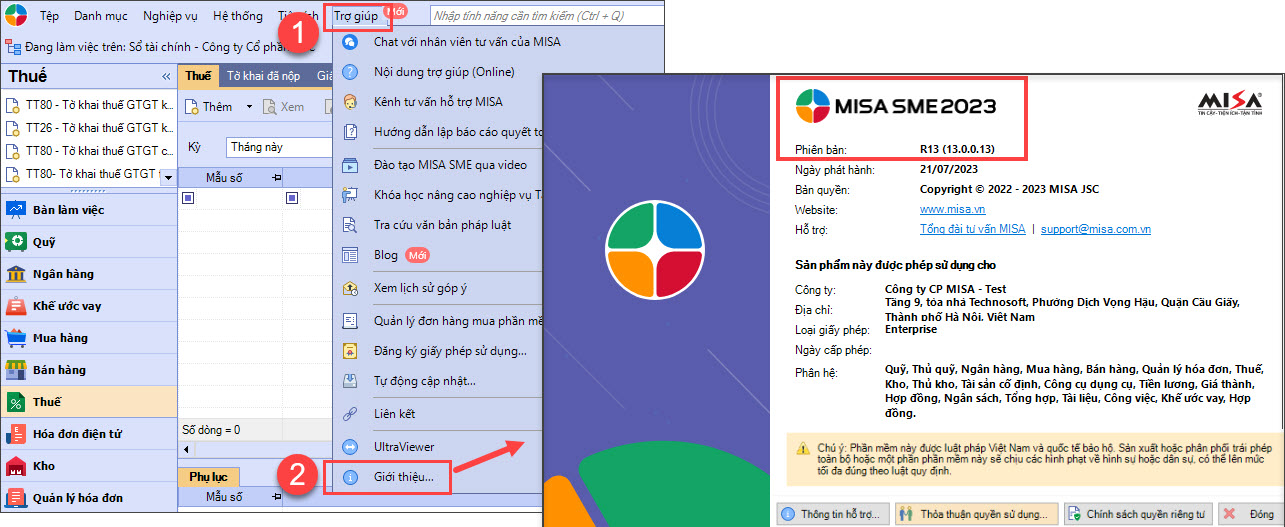 - Cách xem phiên bản: Vào mục Trợ giúp\Giới thiệu\xem dòng sản phẩm và phiên bản R (Ví dụ như hình dưới là dòng MISA SME 2023 và phiên bản R13)
