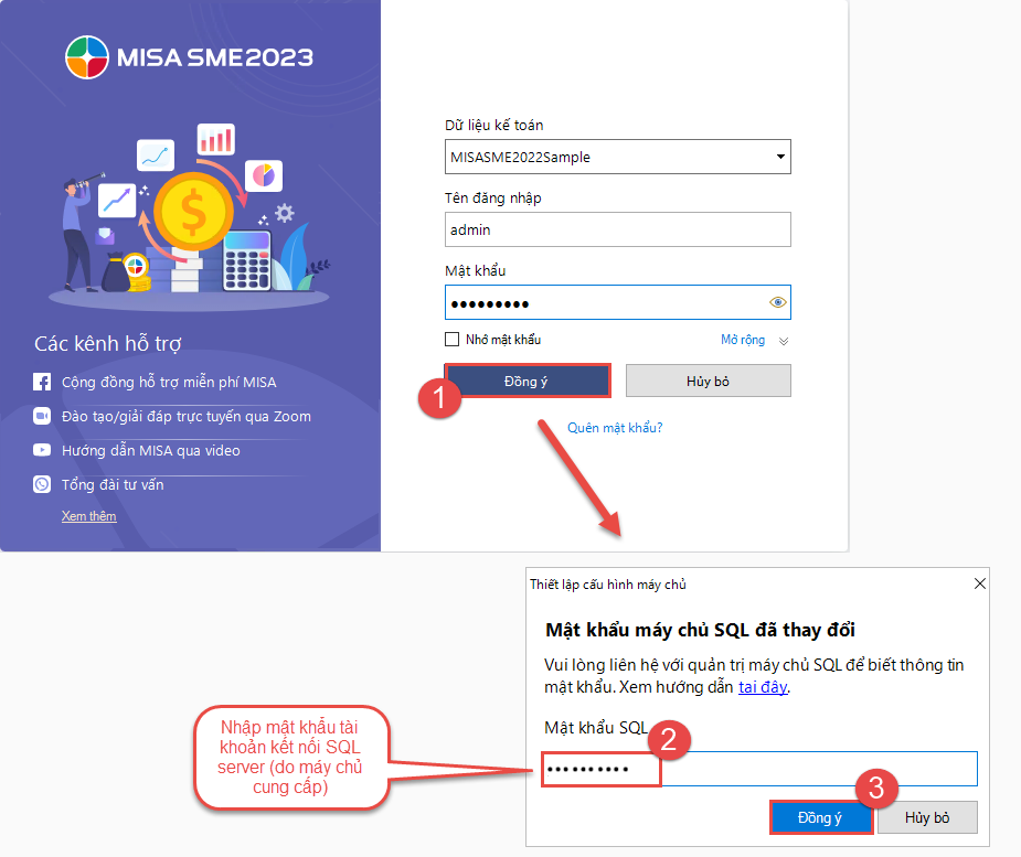 Bước 2: Thoát chương trình ra và đăng nhập lại. Lưu ý: Chương trình sẽ tự động ghi nhớ mật khẩu này, từ lần đăng nhập sau, máy trạm không cần nhập lại Mật khẩu SQL. |