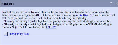 Nguyên nhân 2: Mất kết nối trong mạng LANCách kiểm tra mạng Lan: Kiểm tra mạng Lan theo hướng dẫn tại đây. Giải pháp: Nếu bị mất kết nối mạng Lan trong hệ thống thì Liên hệ với IT (Quản trị mạng) của Doanh nghiệp để được xử lý, đảm báo kết nối mạng LAN ổn định. Nguyên nhân 3: Máy chủ thay đổi mật khẩu của tài khoản kết nối SQL ServerGiải pháp: Bước 1: Liên hệ với máy chủ để lấy lại mật khẩu của tài khoản kết nối SQL Server mới thay đổi (trong khi máy trạm đang kết nối vào máy chủ để làm việc).