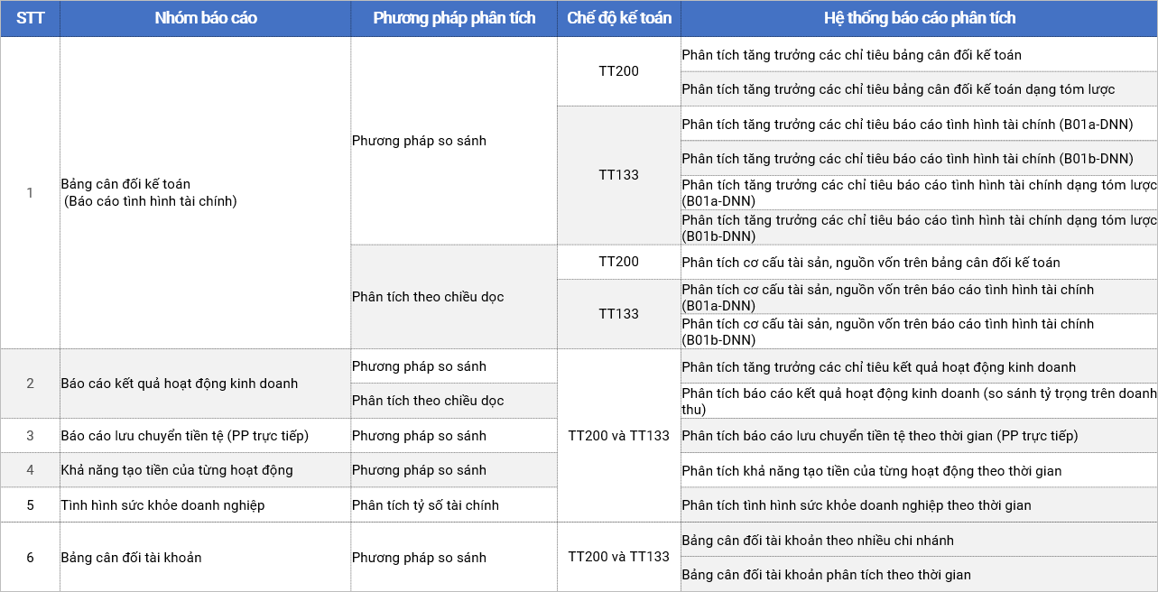 Chương trình cung cấp các báo cáo phân tích báo cáo tài chính theo nhiều phương pháp phân tích khác nhau, cụ thể: