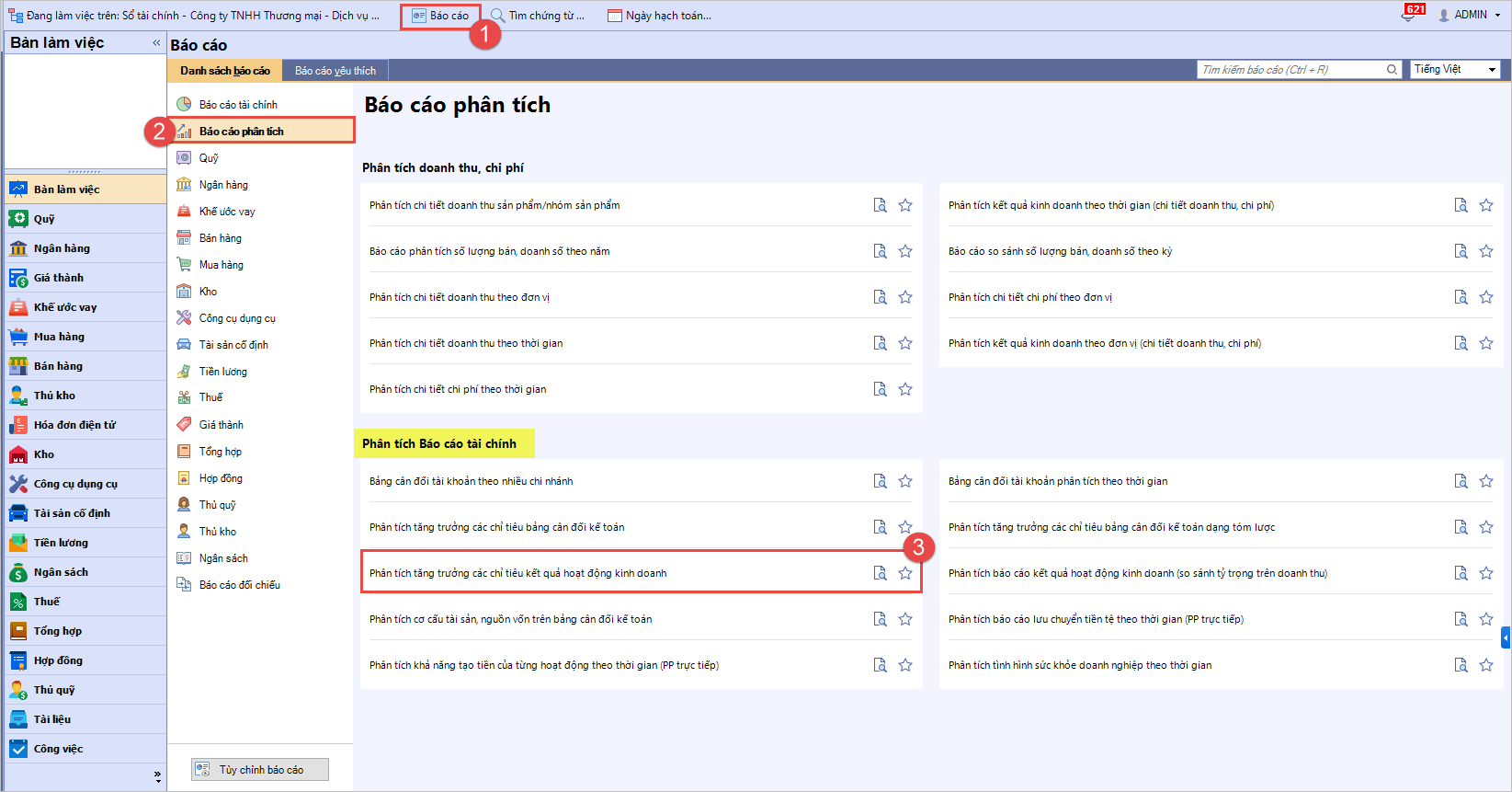 Bước 1: Vào phân hệ Báo cáo, chọn mục Báo cáo phân tích, sau đó chọn báo cáo trong nhóm Phân tích báo cáo tài chính.