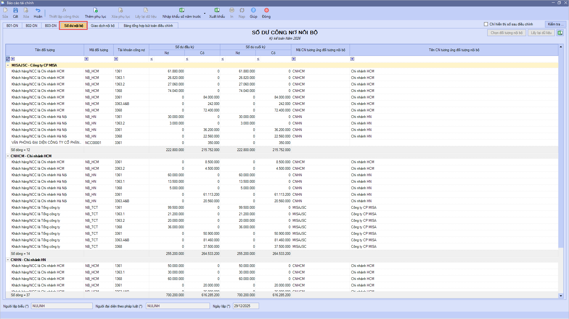 • Trên báo cáo tài chính sẽ tự động tổng hợp được số liệu trên tab Số dư nội bộ và Giao dịch nội bộ: