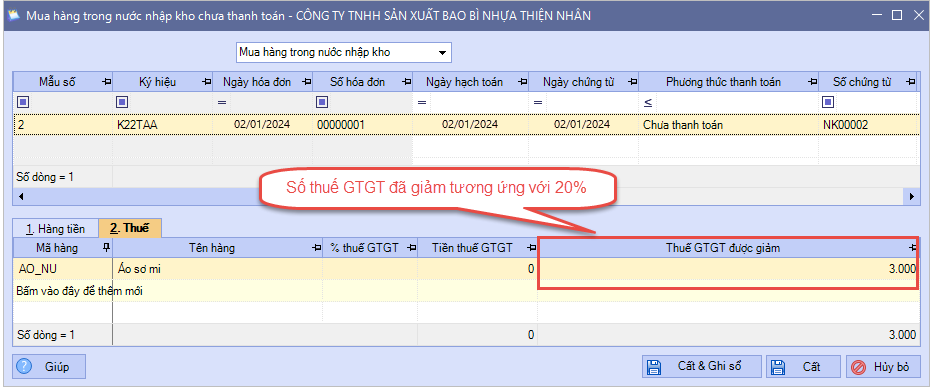 Lưu ý: Giá trị tại cột Thuế GTGT được giảm hiển thị số tiền được giảm trừ thẳng vào giá trị vật tư hàng hóa đối với chứng từ mua hàng hóa đơn trực tiếp.