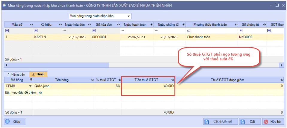 Lưu ý: Giá trị tại cột Thuế GTGT được giảm hiển thị số tiền được giảm trừ thẳng vào giá trị vật tư hàng hóa đối với chứng từ mua hàng hóa đơn trực tiếp.