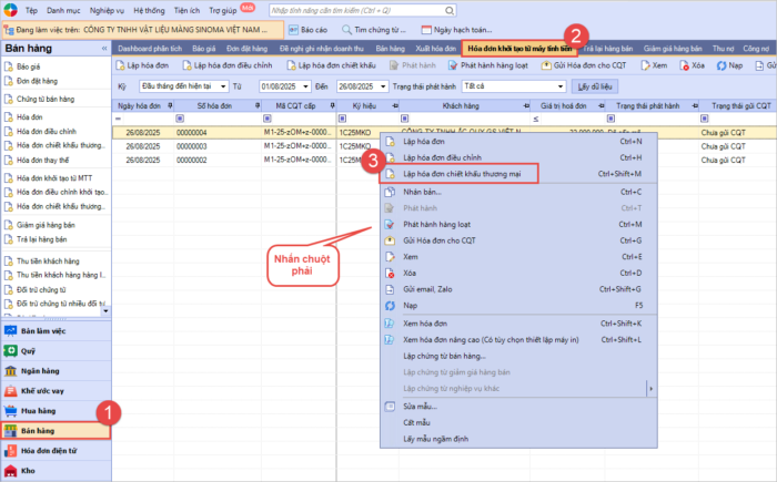- Hoặc trên menu chuột phải, chọn Hóa đơn chiết khấu thương mại.