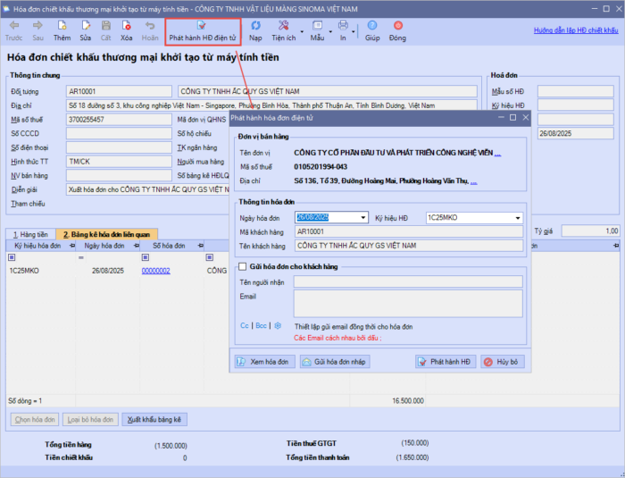 Bước 6: Thực hiện phát hành hóa đơn chiết khấu tương tự như việc phát hành hóa đơn điện tử thông thường.