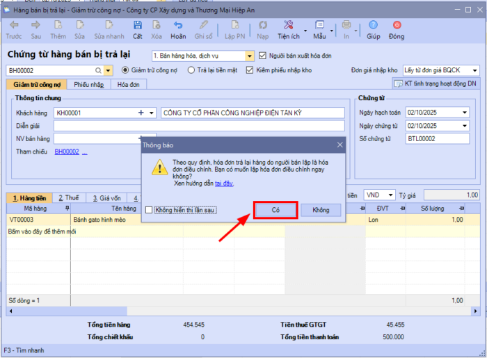 Hoặc khi Cất Chứng từ hàng bán bị trả lại (có tích Người bán xuất hóa đơn), chương trình show thông báo hỏi có muốn sinh hóa đơn điều chỉnh ngay không. Nhấn Có để sinh ngay hóa đơn điều chỉnh.