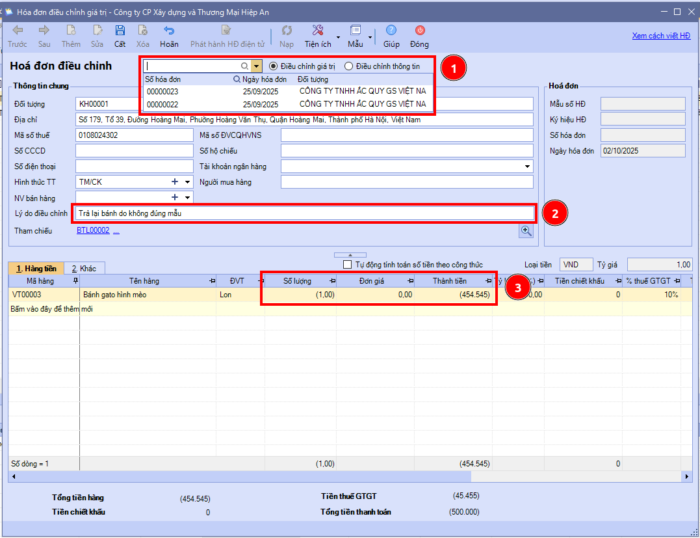 Bước 3: Nhập lý do trả lại hàng vào dòng Lý do điều chỉnh và kiểm tra lại thông tin trên hóa đơn trước khi Cất.