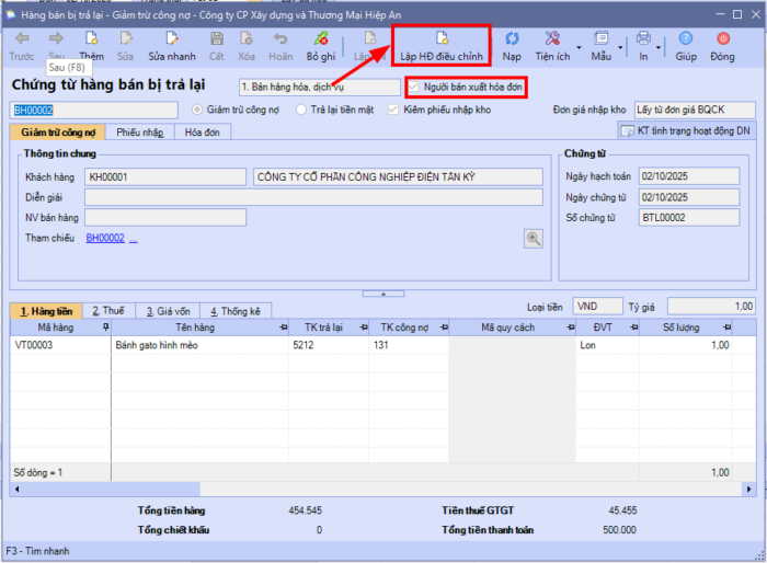 - Mỗi chứng từ hàng bán bị trả lại chỉ cho phép sinh 1 hóa đơn điều chỉnh tương ứng.