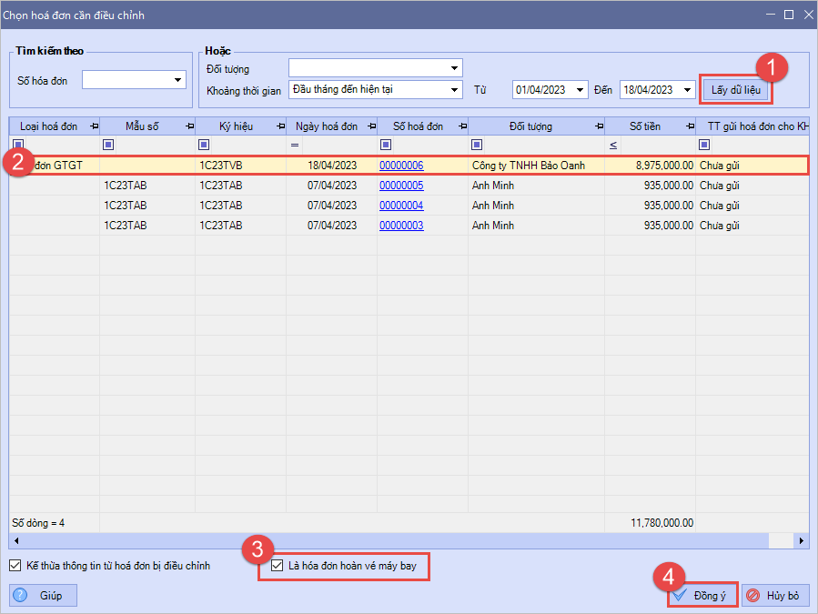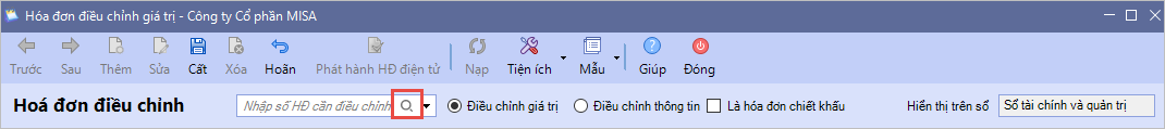 Bước 3: Tích vào biểu tượng kính lúp, thiết lập điều kiện tìm hóa đơn và ấn Lấy dữ liệu và chọn hóa đơn muốn điều chỉnh