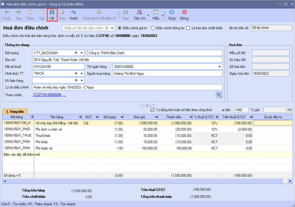 Bước 8: Nhấn Cất và thực hiện phát hành hóa đơn điện tử theo ký hiệu mẫu hoàn vé đã tạo như bình thường. Xem hướng dẫn phát hành hóa đơn điện tử tại đây
