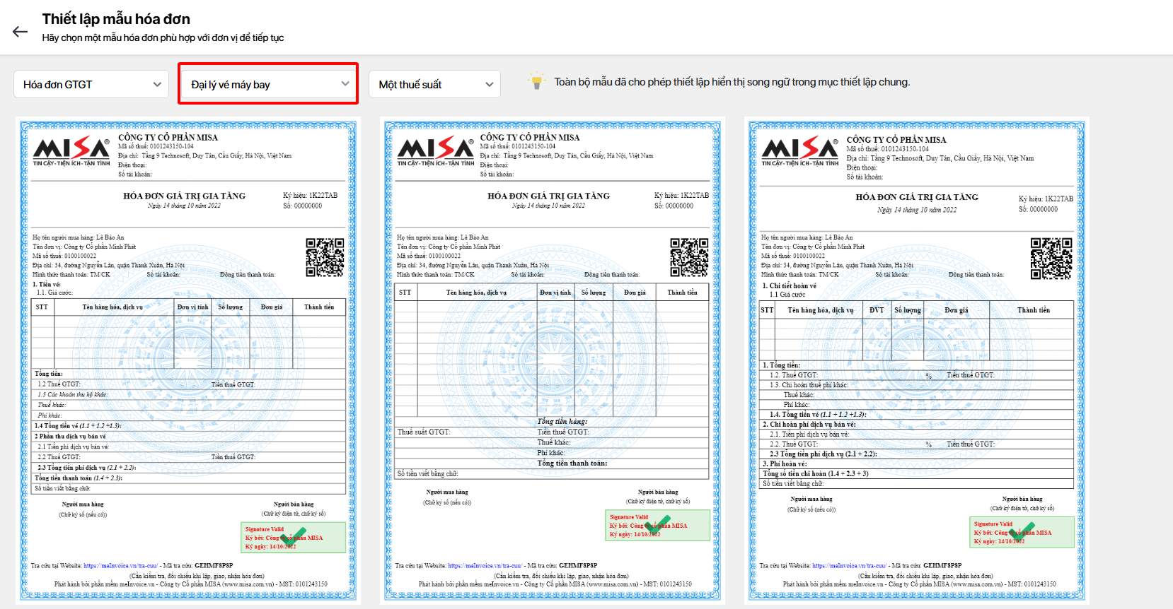 Phạm vi áp dụng: Dành cho các đơn vị phát hành hóa đơn điện tử trên phần mềm MISA Bước 1: Khởi tạo mẫu hóa đơn Đại lý vé máy bay từ bộ mẫu có sẵn trên meInvoice Web, xem hướng dẫn tại đây Bước 2: Vào mục Hóa đơn điện tử\Mẫu hoa đơn, tích nút Lấy mẫu hóa đơn, thông báo phát hành từ MISA meInvoice để đồng bộ mẫu vé máy bay vừa khởi tạo ở bước 1 về PMKT SME Xem hướng dẫn tại đây Bước 3: Sau khi lấy mẫu vé máy bay về MISA SME, chương trình sẽ tự động thêm vào danh mục Vật tư hàng hóa các mã hàng sau (nếu chưa có trong danh mục) gồm: VEMAYBAY_PHIKHAC, VEMAYBAY_THUEKHAC, VEMAYBAY_PHIDVBANVE Lưu ý: Bước 4: Vào mục Bán hàng tích chọn Chứng từ bán hàng hoặc tích nút Thêm. Trong chứng từ tích ô Lập kèm hóa đơn Bước 5: Khai báo thông tin của chứng từ bán vé máy bay. Kế toán nhập các mã hàng vé máy bay do kế toán đã tự thêm trong danh mục vật tư hàng hóa và chọn các mã hàng VEMAYBAY_PHIKHAC, VEMAYBAY_THUEKHAC, VEMAYBAY_PHIDVBANVE do hệ thống tự sinh ở bước 3 để nhập liệu thông tin chứng từ bán vé máy bay Bước 6: Sau khi nhập liệu chứng từ bán hàng xong, anh chị ấn Cất rồi ấn Phát hành HĐ điện tử và thực hiện phát hành như bình thường. Xem hướng dẫn phát hành hóa đơn tại đây Bước 1: Khởi tạo mẫu hóa đơn Đại lý vé máy bay từ bộ mẫu có sẵn trên meInvoice Web, xem hướng dẫn tại đây Bước 2: Vào mục Hóa đơn điện tử\Mẫu hoa đơn, tích nút Lấy mẫu hóa đơn, thông báo phát hành từ MISA meInvoice để đồng bộ mẫu vé máy bay vừa khởi tạo ở bước 1 về PMKT SME Xem hướng dẫn tại đây Bước 3: Sau khi lấy mẫu vé máy bay về MISA SME, chương trình sẽ tự động thêm vào danh mục Vật tư hàng hóa các mã hàng sau (nếu chưa có trong danh mục) gồm: VEMAYBAY_PHIKHAC, VEMAYBAY_THUEKHAC, VEMAYBAY_PHIDVBANVE Lưu ý: Bước 4: Vào mục Bán hàng tích chọn Chứng từ bán hàng hoặc tích nút Thêm. Trong chứng từ bỏ tích ô Lập kèm hóa đơn Bước 5: Khai báo thông tin của chứng từ bán vé máy bay. Kế toán nhập các mã hàng vé máy bay do kế toán đã tự thêm trong danh mục vật tư hàng hóa và chọn các mã hàng VEMAYBAY_PHIKHAC, VEMAYBAY_THUEKHAC, VEMAYBAY_PHIDVBANVE do hệ thống tự sinh ở bước 3 để nhập liệu thông tin chứng từ bán vé máy bay Bước 6: Sau khi nhập liệu chứng từ bán hàng xong, ấn Cất rồi ấn Lập HĐ. Hệ thống sẽ kế thừa dữ liệu đã nhập ở chứng từ bán hàng sang hóa đơn Bước 7: Ấn Cất hóa đơn rồi ấn nút Phát hành HĐ điện tử. Thực hiện phát hành hóa đơn như bình thường theo hướng dẫn tại đây Bước 1: Khởi tạo mẫu hóa đơn Đại lý vé máy bay từ bộ mẫu có sẵn trên meInvoice Web, xem hướng dẫn tại đây Bước 2: Vào mục Hóa đơn điện tử\Mẫu hoa đơn, tích nút Lấy mẫu hóa đơn, thông báo phát hành từ MISA meInvoice để đồng bộ mẫu vé máy bay vừa khởi tạo ở bước 1 về PMKT SME Xem hướng dẫn tại đây Bước 3: Sau khi lấy mẫu vé máy bay về MISA SME, chương trình sẽ tự động thêm vào danh mục Vật tư hàng hóa các mã hàng sau (nếu chưa có trong danh mục) gồm: VEMAYBAY_PHIKHAC, VEMAYBAY_THUEKHAC, VEMAYBAY_PHIDVBANVE Lưu ý: Bước 4: Vào mục Bán hàng\Hóa đơn hoặc Bán hàng\Tab Xuất hóa đơn ấn Thêm để tạo hóa đơn Đại lý vé máy bay Bước 5: Khai báo thông tin của hóa đơn bán vé máy bay. Kế toán nhập các mã hàng vé máy bay do kế toán đã tự thêm trong danh mục vật tư hàng hóa và chọn các mã hàng VEMAYBAY_PHIKHAC, VEMAYBAY_THUEKHAC, VEMAYBAY_PHIDVBANVE do hệ thống tự sinh ở bước 3 để nhập liệu thông tin hóa đơn bán vé máy bay Bước 6: Sau khi nhập liệu dữ liệu hóa đơn, ấn Cất rồi ấn Phát hành HĐ điện tử như bình thường. Xem hướng dẫn tại đây Bước 7: Trên giao diện hóa đơn, ấn Lập CTBH. Dữ liệu của chứng từ bán hàng sẽ được kế thừa từ hóa đơn vừa phát hành. Nhấn Cất chứng từ bán hàng
