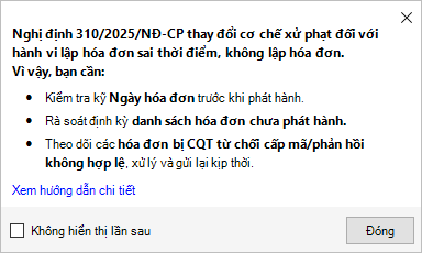 Mục đích bài viết: Nghị định 310/2025/NĐ-CP đã thay đổi quy định về xử phạt với các hành vi lập hóa đơn sai thời điểm hoặc không lập hóa đơn. Nhiều doanh nghiệp có thể chưa nắm rõ quy trình mới, dễ mắc sai sót dẫn đến bị xử phạt. Bài hướng dẫn này sẽ giúp người dùng cập nhật kịp thời quy định mới, thực hiện đúng nghiệp vụ lập và phát hành hóa đơn trên phần mềm MISA SME để tránh rủi ro bị xử phạt do sai sót trong quy trình thực hiện.