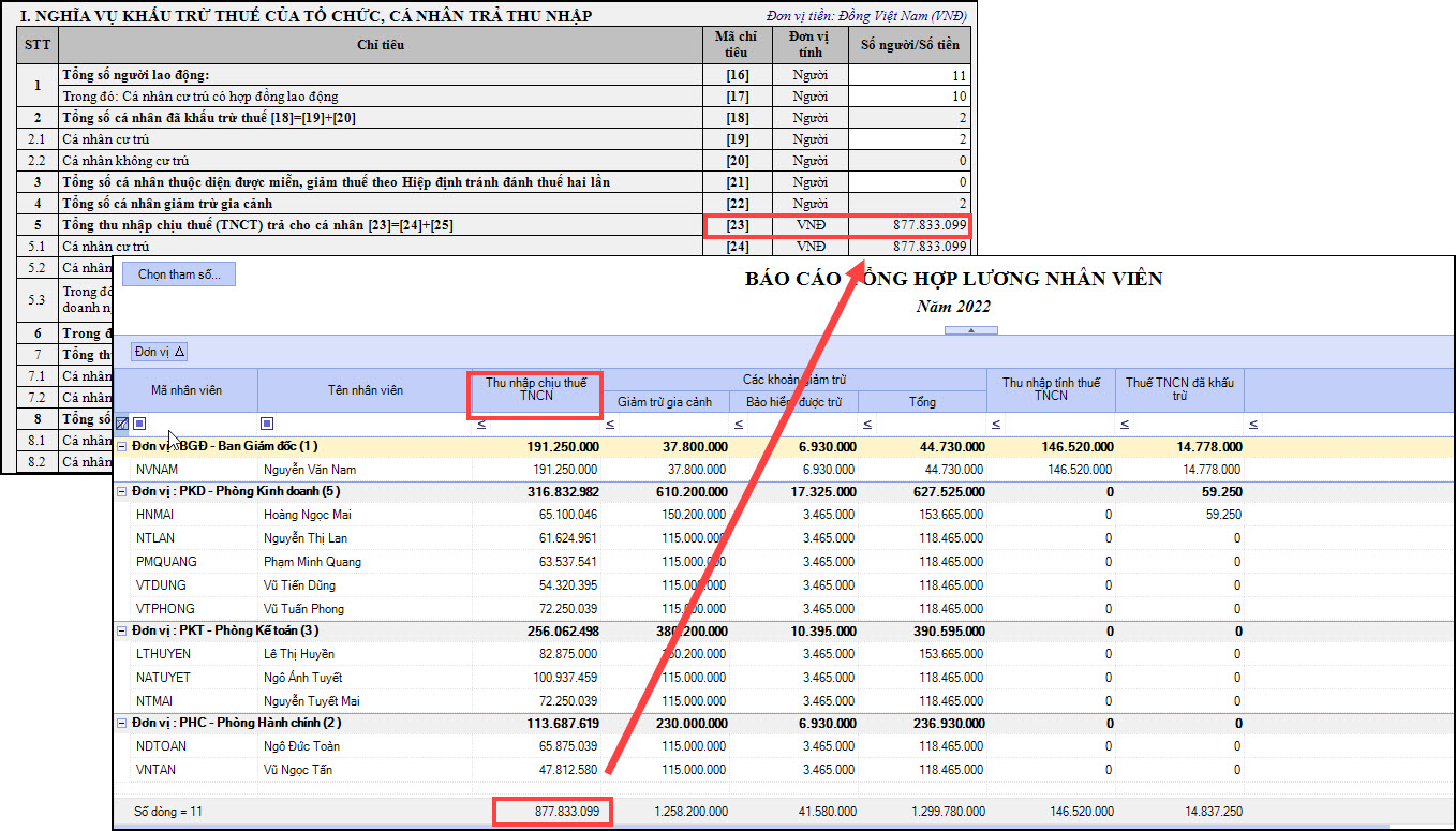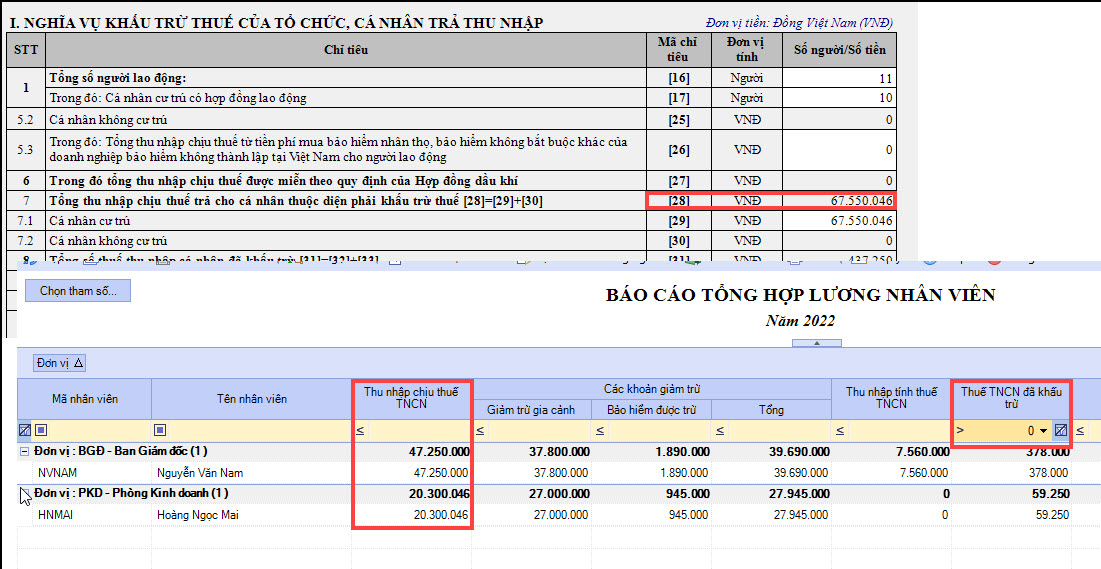 3.4. Cách lấy số liệu chỉ tiêu 28 - Tổng thu nhập chịu thuế (TNCT) trả cho cá nhân thuộc diện phải khấu trừ thuếBước 1: Vào Báo cáo\ Tiền lương\ Báo cáo tổng hợp lương nhân viên Bước 2: Chọn xem thời gian xem báo cáo Bước 3: Lọc các đối tượng có cột Thuế TNCN đã khấu trừ > 0 Bước 4: Chỉ tiêu số 28 sẽ bằng tổng cột Thu nhập chịu thuế TNCN của các đối tượng