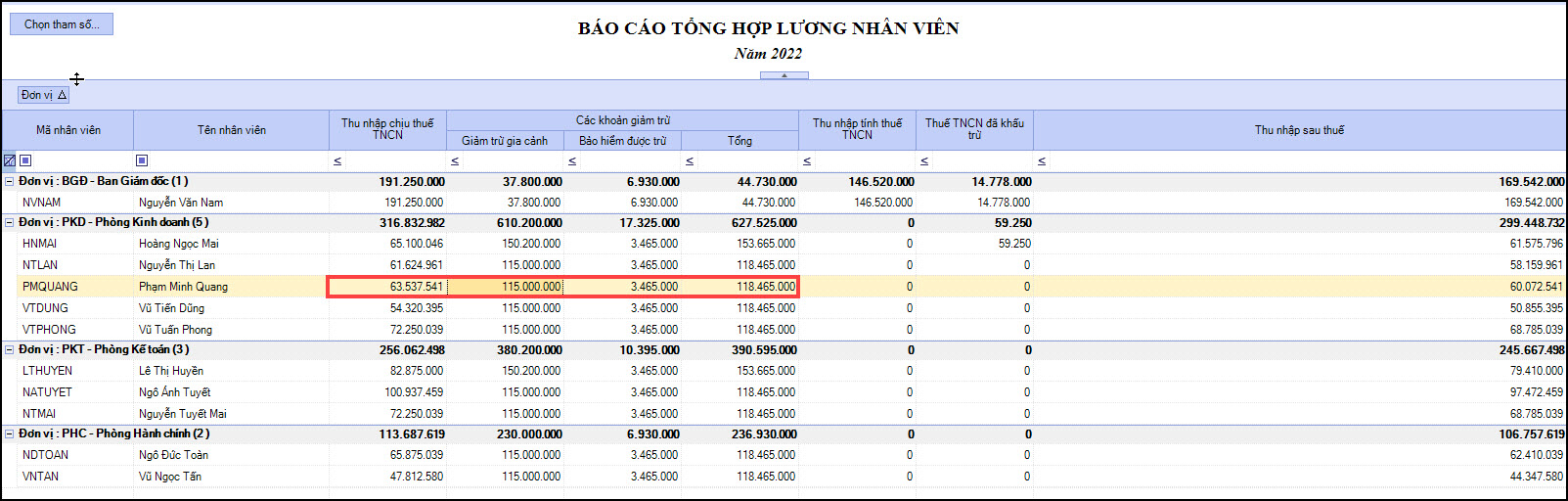3.2. Bảng tổng hợp lương nhân viên không hiển thị số liệu cột Thu nhập tính thuếNguyên nhân: Cột Thu nhập tính thuế = Thu nhập chịu thuế TNCN – Bảo hiểm được trừ – Giảm trừ gia cảnh Nếu nhỏ hơn 0 thì không hiển thị.