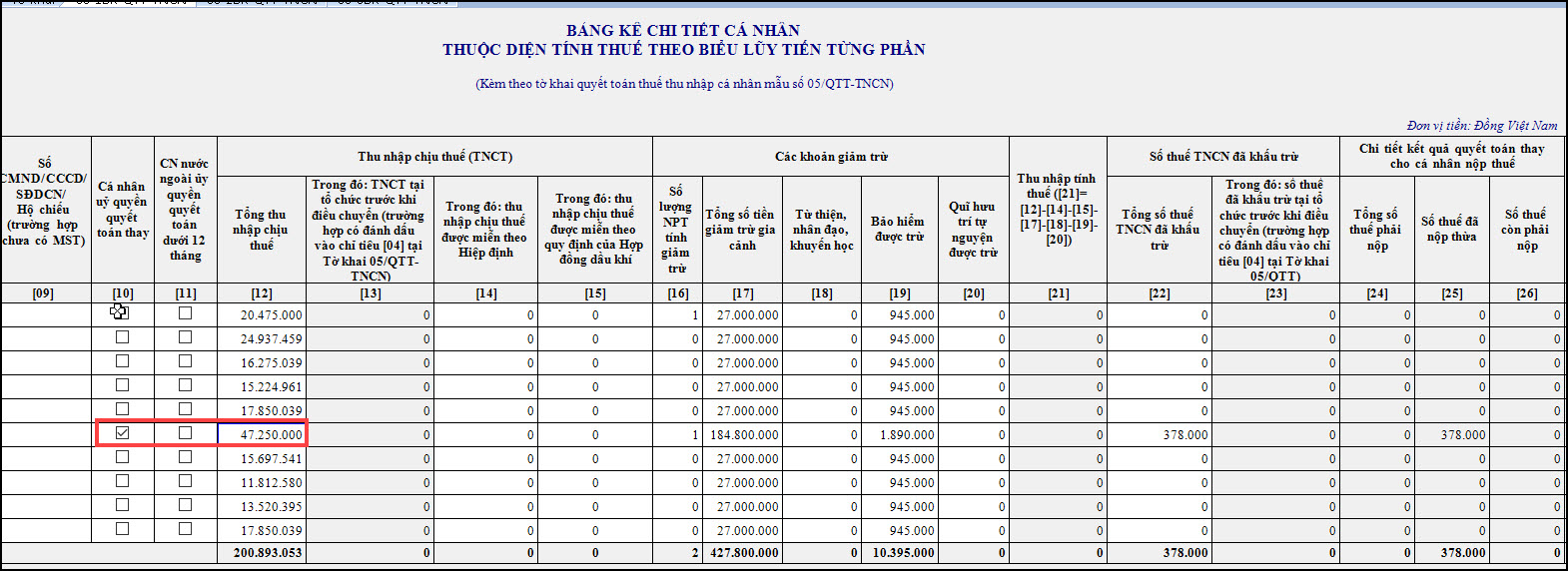 Tổng số thuế phải nộp của từng đối tượng = Dòng số liệu phát sinh cột 12 có tích tại cột 10 của bảng kê 05-1 x thuế suất biếu thuế lũy tiến theo kỳ tính thuế