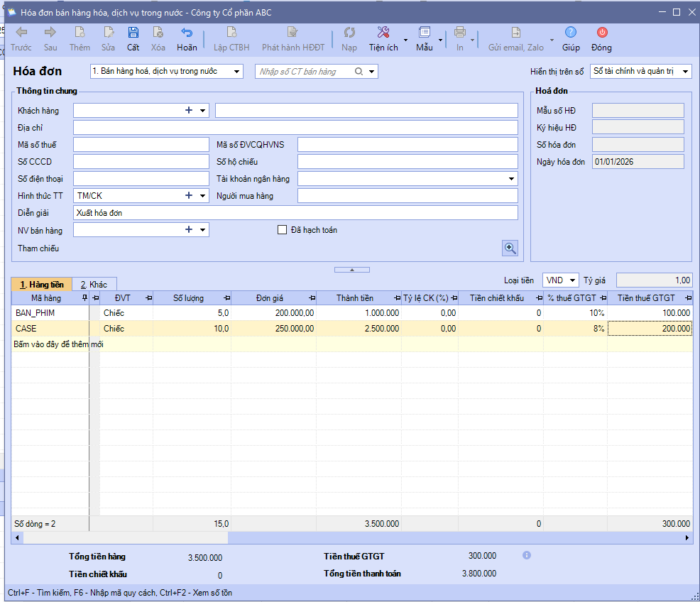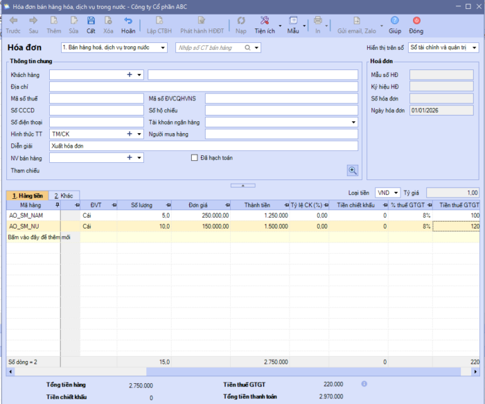 Khi lập hóa đơn, kế toán chọn mức thuế suất 8% đối với hàng hóa, dịch vụ được giảm thuế.(Lưu ý: Cần kiểm tra lại xem mẫu hóa đơn nhiều thuế suất năm 2025 đã hiển thị mức thuế suất 8% hay chưa).