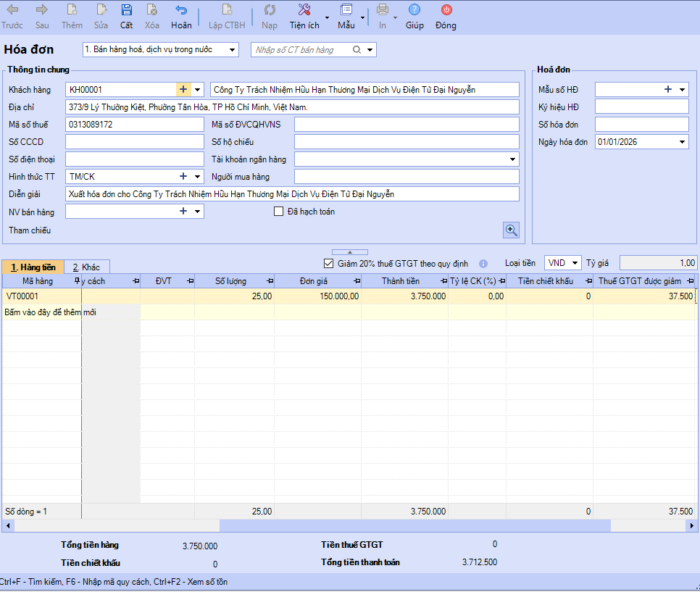 Khi lập hóa đơn tích chọn Giảm 20% thuế GTGT theo quy định.