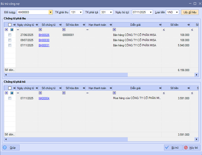 Bước 2: Vào menu Nghiệp vụ\Mua hàng\Bù trừ công nợ, hoặc Nghiệp vụ\Bán hàng\Bù trừ công nợ Bước 3: Chọn đối tượng được thiết lập vừa là khách hàng, vừa là nhà cung cấp hiển thị trong danh sách, ngày bù trừ công nợ, và loại tiền, nhấn Lấy dữ liệu. Chương trình hiển thị ra danh sách chứng từ phải thu và chứng từ phải trả