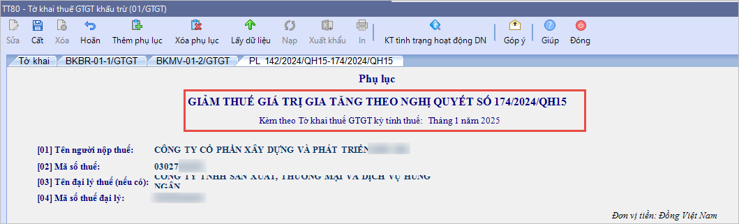 • Nếu kỳ tính thuế là 6 tháng đầu năm 2025, tiêu đề chi tiết phụ lục là Giảm thuế GTGT theo Nghị quyết số 174/2024/QH15