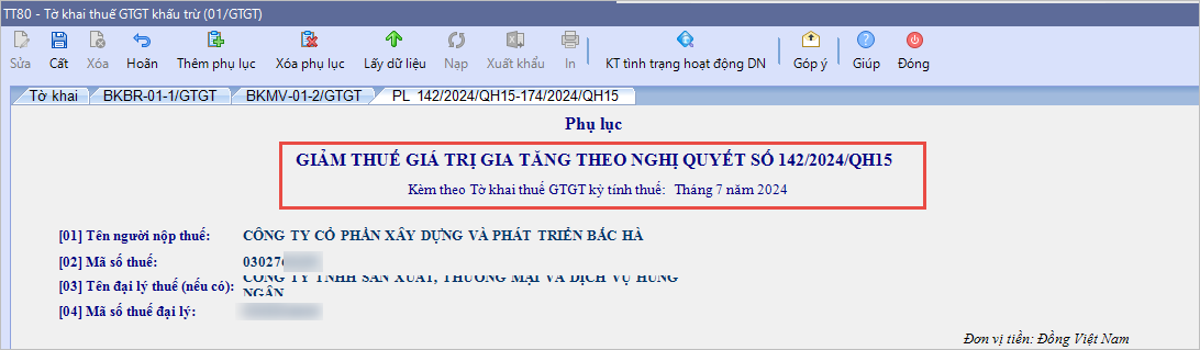 • Nếu kỳ tính thuế là 6 tháng cuối năm 2024, tiêu đề chi tiết phụ lục là Giảm thuế GTGT theo Nghị quyết số 142/2024/QH15