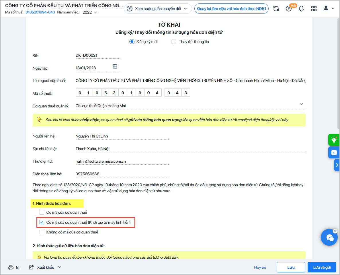 2.1 Bắt đầu sử dụngBước 1: Lập tờ khai đăng ký sử dụng hóa đơn có mã (khởi tạo từ máy tính tiền)