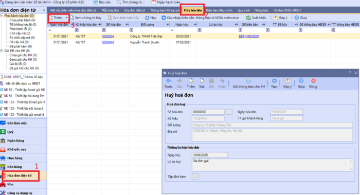 Bước 1: Thực hiện Hủy hóa đơn 00000007 dưới SME bản cũ.
