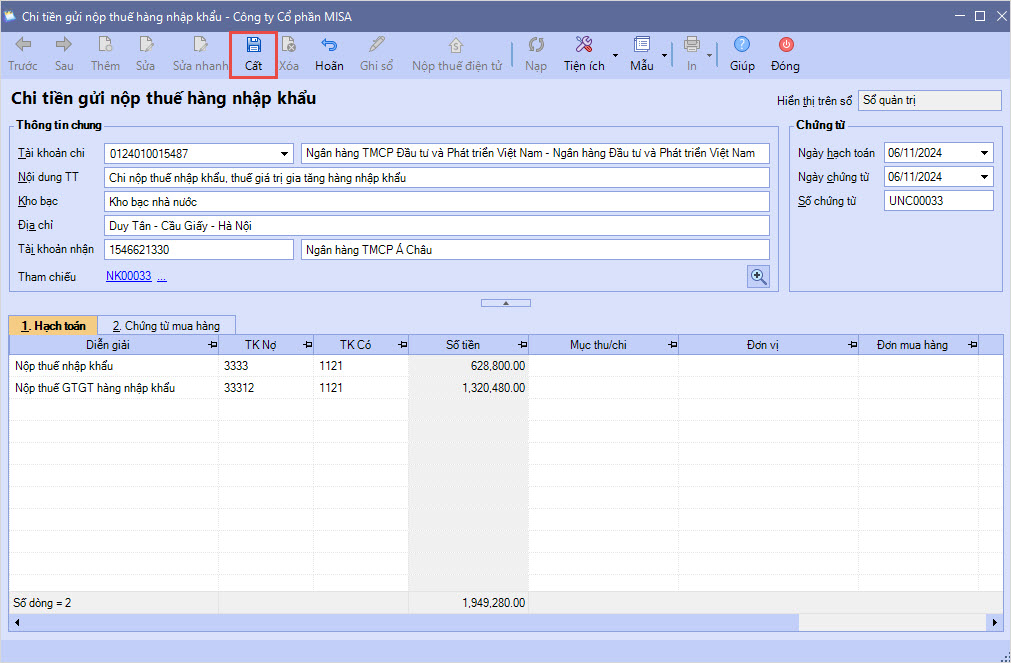 Mục đích: Bài viết này hướng dẫn cách ghi nhận nghiệp vụ nộp thuế GTGT hàng nhập khẩu bằng tiền gửi ngân hàng trên phần mềm kế toán, giúp đảm bảo thực hiện đúng nghĩa vụ thuế và quản lý dòng tiền hiệu quả.