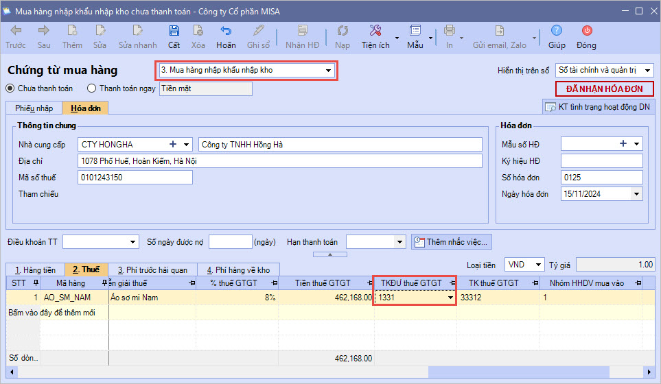 Lưu ý: Nếu tích chọn Không lấy thuế GTGT hàng nhập khẩu có tài khoản đối ứng thuế giá trị gia tăng là 133, chương trình sẽ không lấy lên số thuế GTGT có hạch toán tài khoản đối ứng thuế giá trị gia tăng là 133 trên chứng từ mua hàng nhập khẩu