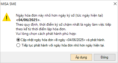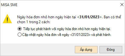 Lưu ý: Khi người dùng phát hành hóa đơn, nếu ngày hóa đơn nhỏ hơn ngày phát hành, chương trình tự động đưa ra thông báo để người dùng chọn lựa: