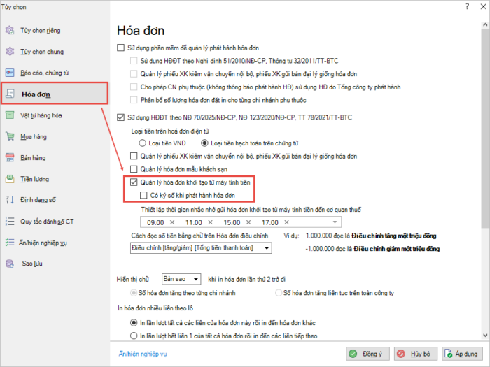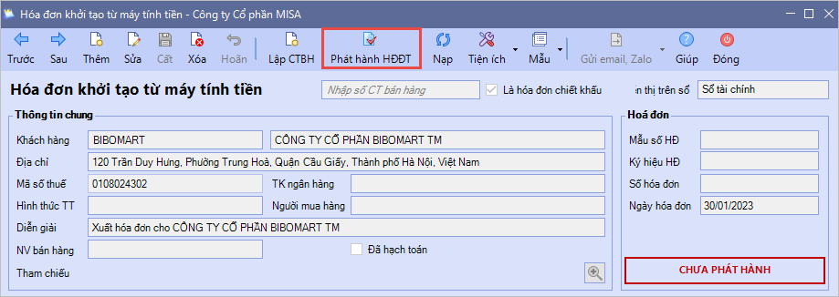 Lưu ý: Tùy theo thiết lập Hệ thống\Tùy chọn\Hóa đơn, có/không chọn Có ký số khi phát hành hóa đơn hóa đơn khởi tạo từ máy tính tiền, Khi phát hành HĐĐT: