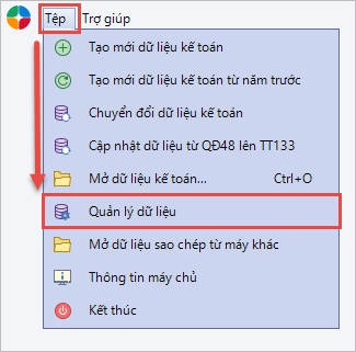 Bước 1: Tại màn hình đăng nhập, vào menu Tệp\Quản lý dữ liệu.