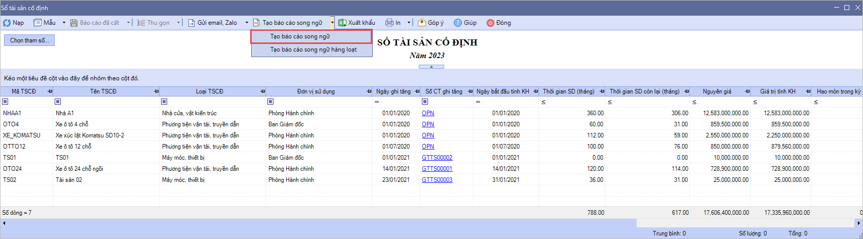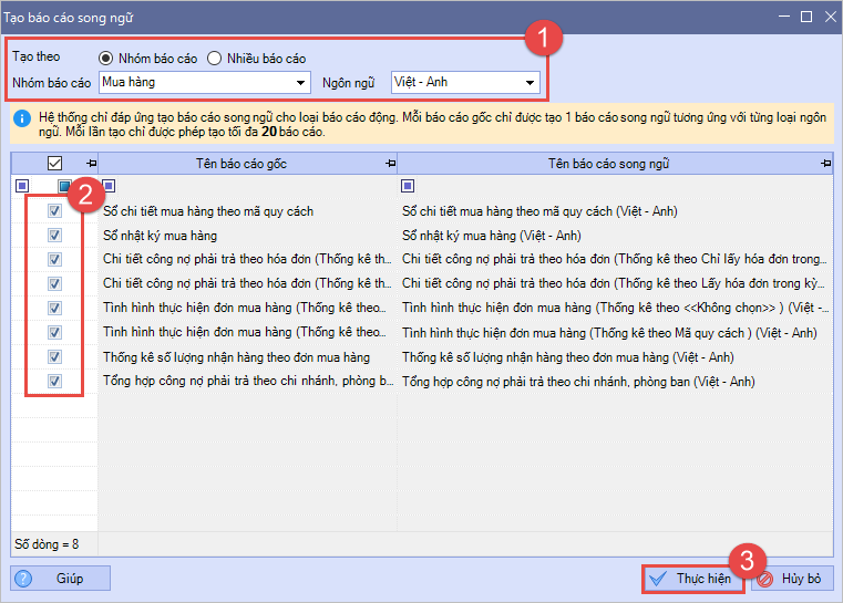 - Người dùng không thể tạo báo cáo song ngữ cho các báo cáo chưa được phân quyền sử dụng tương ứng.