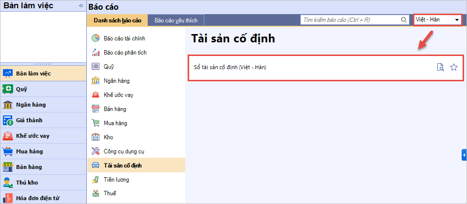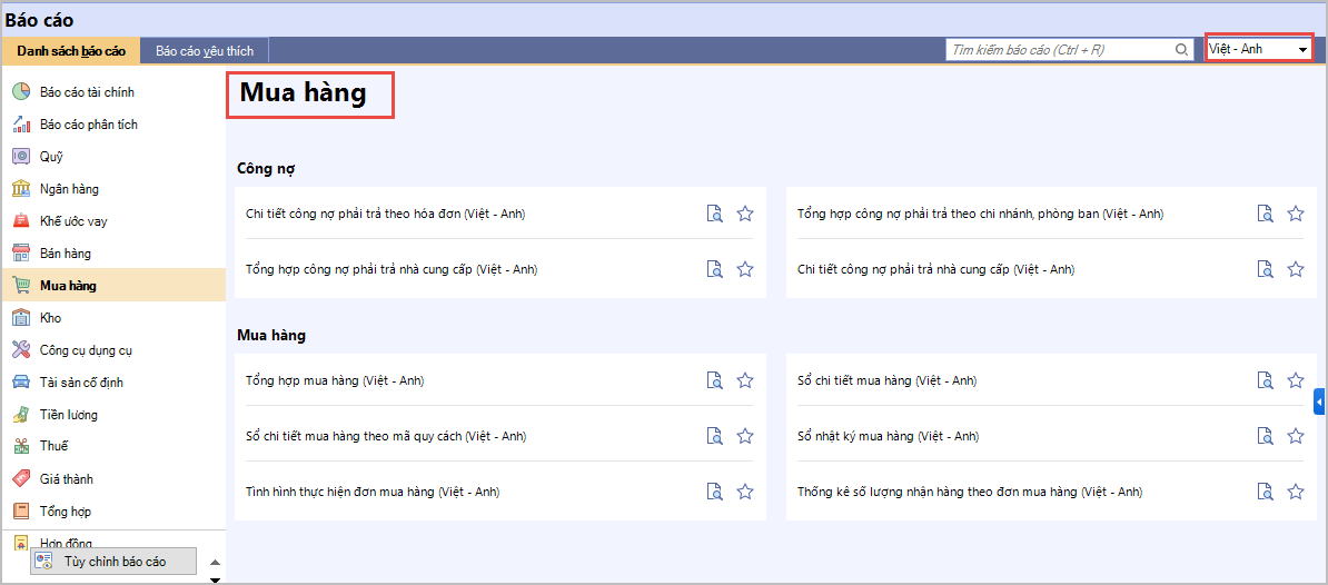 Bước 4: Sau khi tạo mới, quay lại giao diện danh sách báo cáo chọn ngôn ngữ (Việt – Anh hoặc Việt – Trung hoặc Việt – Hàn) như bước 2 đã chọn, báo cáo song ngữ sẽ hiển thị trên danh sách thuộc nhóm báo cáo tương ứng.
