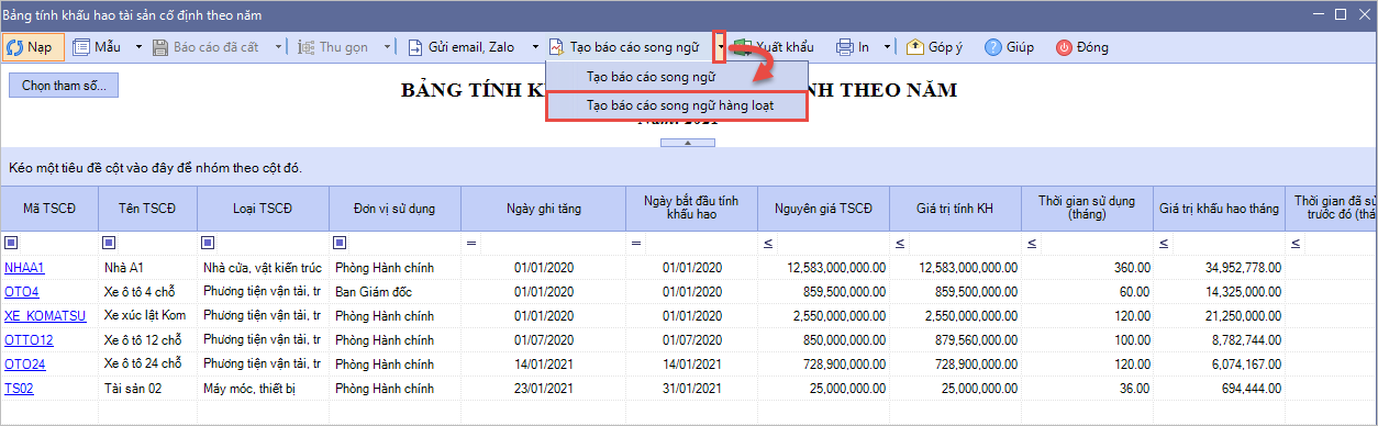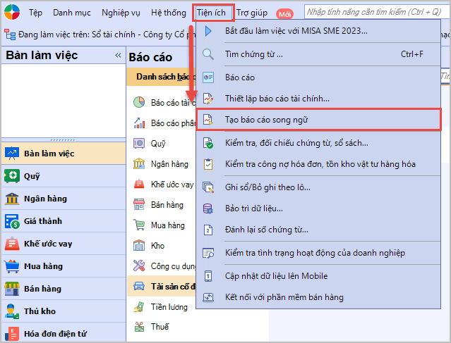 Trường hợp 2: Tạo hàng loạt báo cáo song ngữPhù hợp cho kế toán cần theo dõi, tổng hợp số liệu đa chiều từ nhiều báo cáo, dễ dàng tạo nhanh hàng loạt báo cáo song ngữ. Bước 1: Vào Tiện ích, chọn Tạo báo cáo song ngữ. Hoặc trên giao diện báo cáo chi tiết, chọn Tạo báo cáo song ngữ\Tạo báo cáo song ngữ hàng loạt.