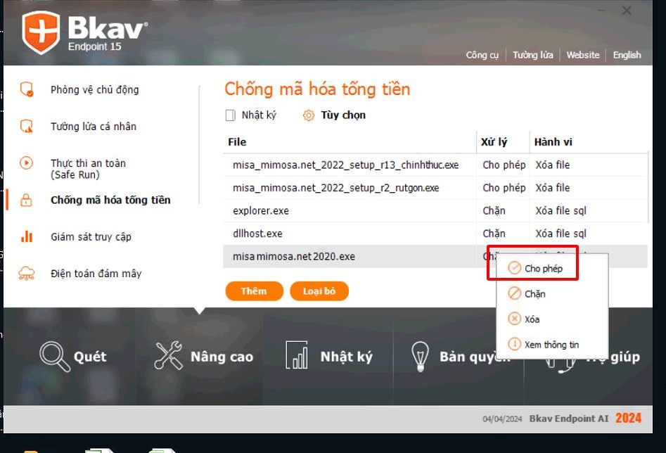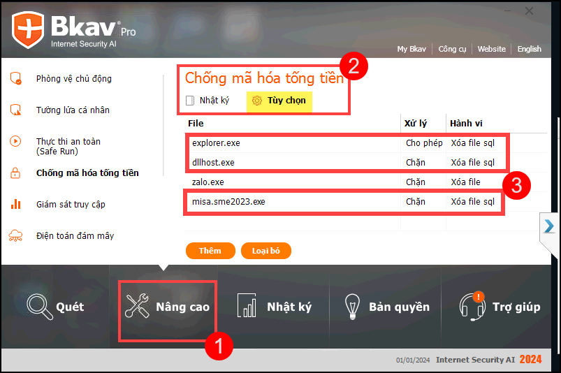 Bước 2: Tại Chống mã hóa tống tiền\tích Tùy chọn. Tại dòng tiến trình ghi nhận đang bị chặn (dòng MISA SME và các dòng đang ghi nhận là xóa file SQL) tích chọn cho phép.