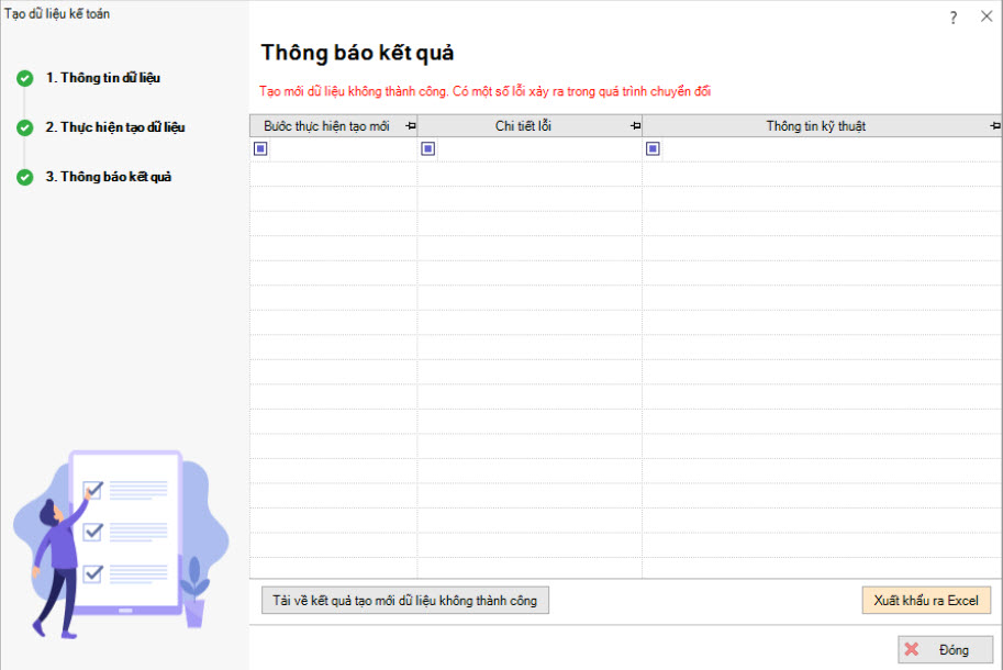 Tạo dữ liệu kế toán\Tách dữ liệu báo lỗi: Tạo mới dữ liệu không thành công. Có một số lỗi xảy ra trong quá trình chuyển đổi