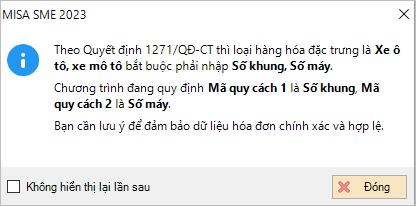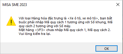 - MISA SME ngầm định: Với hàng hóa là xe ô tô, xe mô tô bắt buộc phải nhập Mã quy cách 1 tương ứng với số khung, Mã quy cách 2 tương ứng với số máy: