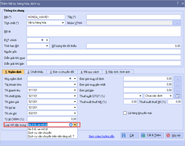 Bước 1: Đối với các đơn vị kinh doanh Xe mô tô, xe ô tô: Trên danh mục Vật tư hàng hóa bổ sung thông tin Loại hàng hóa đặc trưng để người dùng có thể nhập Số khung, số máy của xe mô tô/ô tô: