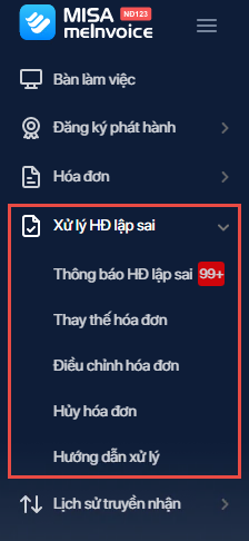 2.1 Hướng dẫn thay thế, điều chỉnh hóa đơn điện tử trên MISA SME2.2 Xử lý hóa đơn sai sót trên meInvoice Web và lấy dữ liệu về hạch toán dưới MISA SMEBước 1. Vào menu Xử lý HĐ lập sai trên meInvoice, thực hiện thay thế/điều chỉnh hóa đơn sai sót. Xem hướng dẫn tại đây. Bước 2. Sau khi lập hóa đơn thay thế/điều chỉnh trên meInvoice, tại phân hệ Bán hàng → Đề nghị ghi nhận doanh thu nhấn Lấy DL từ MISA meInvoice Bước 3. Hạch toán hóa đơn điều chỉnh, lập chứng từ bán hàng cho hóa đơn thay thế – Hạch toán hóa đơn điều chỉnh: Thực hiện theo hướng dẫn Tại đây. – Lập chứng từ bán hàng cho hóa đơn thay thế: Thực hiện theo hướng dẫn Tại đây. |