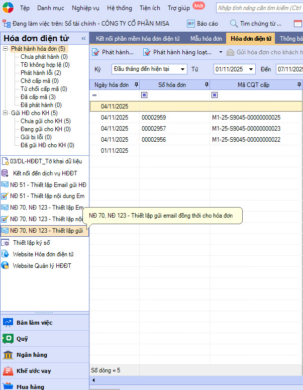 Cách 1: Trên thanh menu của phân hệ Hóa đơn điện tử, chọn chức năng NĐ70, NĐ 123 – Thiết lập gửi email đồng thời cho hóa đơn