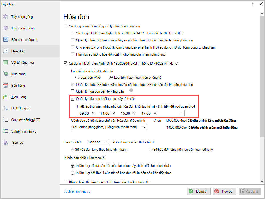 - Cài đặt thời gian nhắc nhở gửi hóa đơn tới Cơ quan thuế.