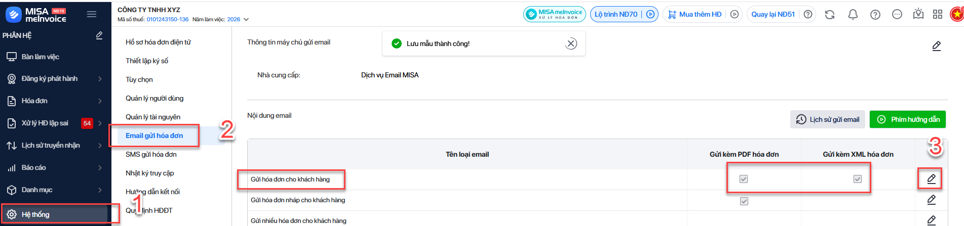 - Thiết lập lại việc có gửi hai file PDF và XML hóa đơn cho người mua bằng cách nhấn Thiết lập email gửi hóa đơn trên thông báo. Chương trình sẽ tự động điều hướng sang giao diện thiết lập trên MISA meInvoice để anh/chị tiếp tục thực hiện thao tác.