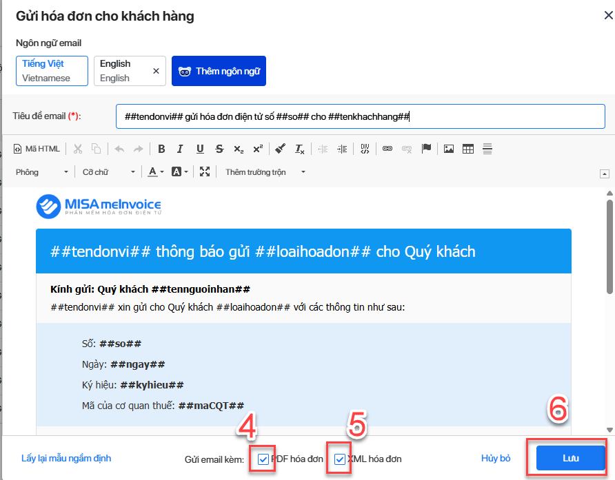 - Nếu vẫn muốn gửi tệp đính kèm email, người bán có thể truy cập vào Hệ thống\Email gửi hóa đơn trên meInvoice để thiết lập